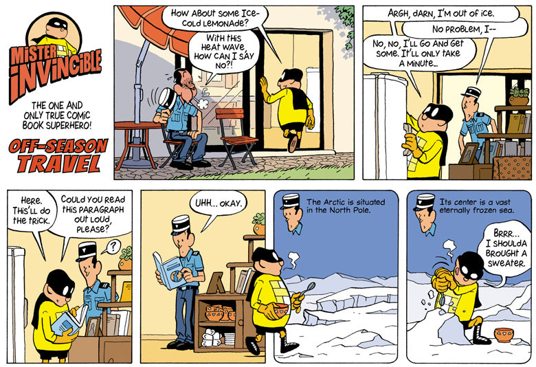 Meet Mister Invincible — he has the amazing power to bend space and time… by breaking the rules of comic books! Panel and page borders can’t contain his might! His incredible, creative intellect always shows him the most amazing solutions to seemingly insurmountable dangers! He truly is the ONE AND ONLY TRUE COMIC BOOK SUPERHERO! NOMINATED FOR TWO 2021 EISNER AWARDS!
