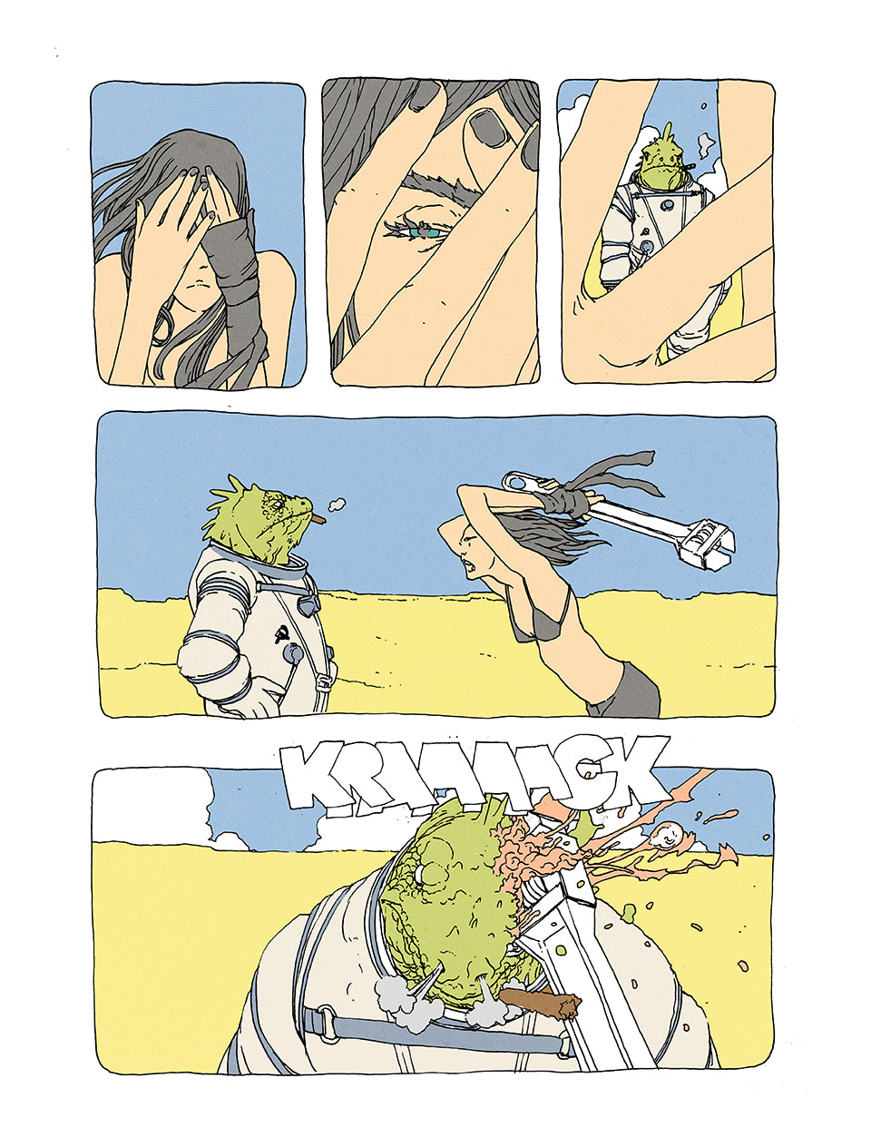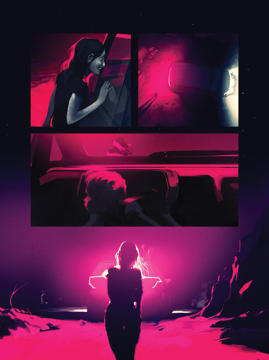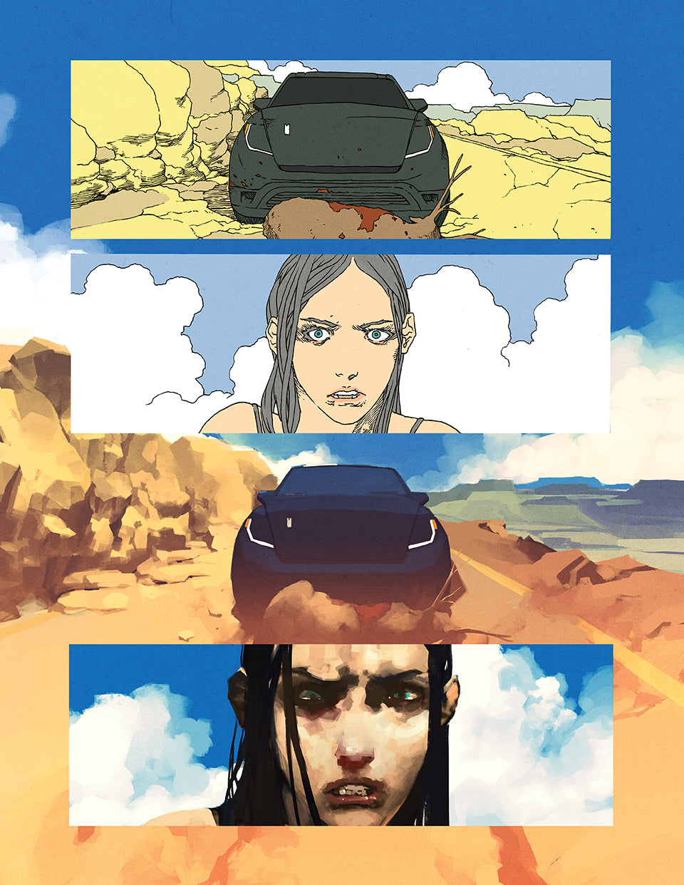 MONOLITH is a visually stunning suspense thriller illustrated by visionary artist and designer LRNZ (Golem, Viewpoint, Astrogamma) and written by ROBERTO RECCHIONI (Orphans, Dylan Dog) and MAURO UZZEO (Orphans, Dylan Dog). This lushly painted tale began as a graphic novel project before turning quickly into a live-action feature film production, with LRNZ’s visual design direction brought to life. Once principal photography was complete, LRNZ went back to complete the graphic novel as originally envisioned, with highly dynamic visuals that change styles throughout to convey the range of moods, dreams, and psychological trials Sandra experiences during this frightening 48-hour period.