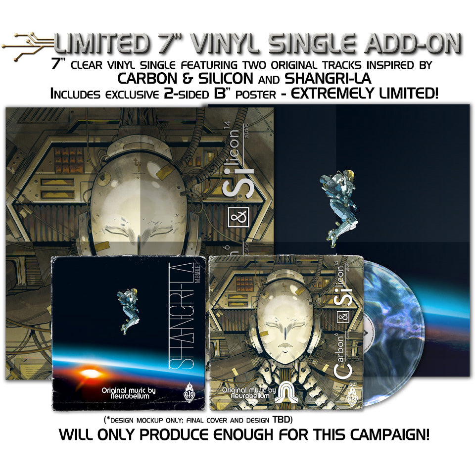 Limited Edition 7" clear vinyl single featuring two original musical tracks inspired by CARBON & SILICON and SHANGRI-LA, produced and recorded by Neurobellum. Includes a limited exclusive 2-sided 13" square poster.