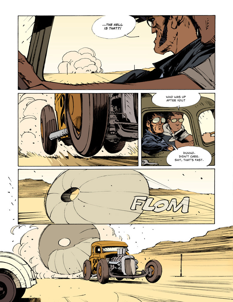 An abandoned stretch of road in the middle of the desert, a rusty old gas station, and a plume of dust rising in the distance… When Billy Joe steps onto old Evel O’Neil’s property, trouble follows close behind: misfits, criminals, cops, and media, all of them in search of freedom, justice, and glory… But only the fastest one among them will get it… NOW SHIPPING!