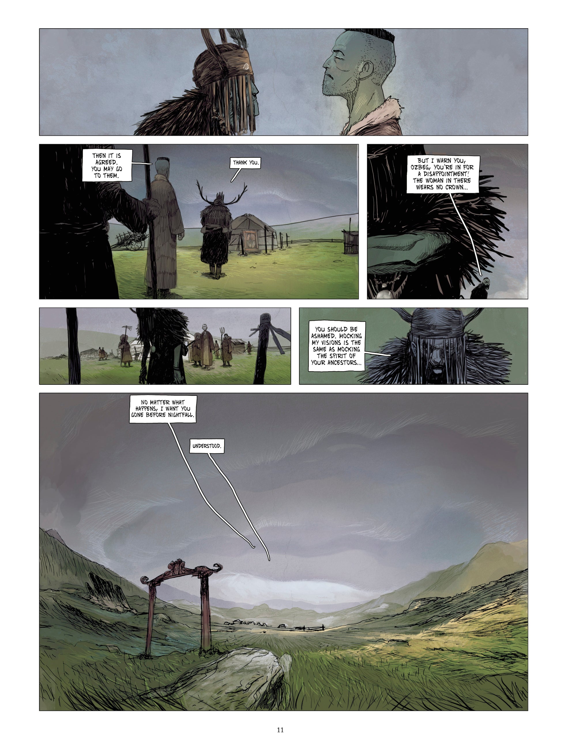 A lush, lyrical, almost operatic fable speculating on the youth of the first Great Khan of the Mongol Empire. Filled with mysticism and surreal visions, this grand epic takes on a fantasy quality lightly infused with just enough nuggets of history to set in time. Torn between a destiny he is told to have and a life he would otherwise chose for himself, the mind of a legendary warlord is laid bare to readers in a cinematic and poetic narrative breathtakingly illustrated by Antoine Carrion.